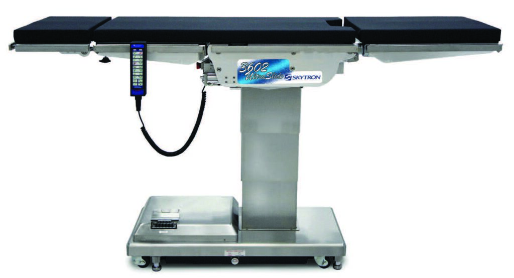 The Skytron 3602 is a surgical table with a 23-inch tabletop slide that allows patients to quickly and easily move through an imaging window. This is an electrohydraulically operated table with battery backup. The Skytron UltraSlide 3602 has a 1000 lb. lift and 800 lb. articulation capacity. The 4-point self-leveling braking system allows for stability on uneven floors. A narrow designed base provides toe space clearance to eliminate surgeon back strain.